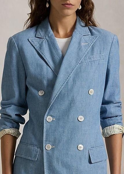 Crafted with cotton chambray, this double-breasted cotton blazer is finely tailored for a straight fit and detailed with genuine mother-of-pearl buttons. Its partial lining achieves a light, season-spanning weight.
